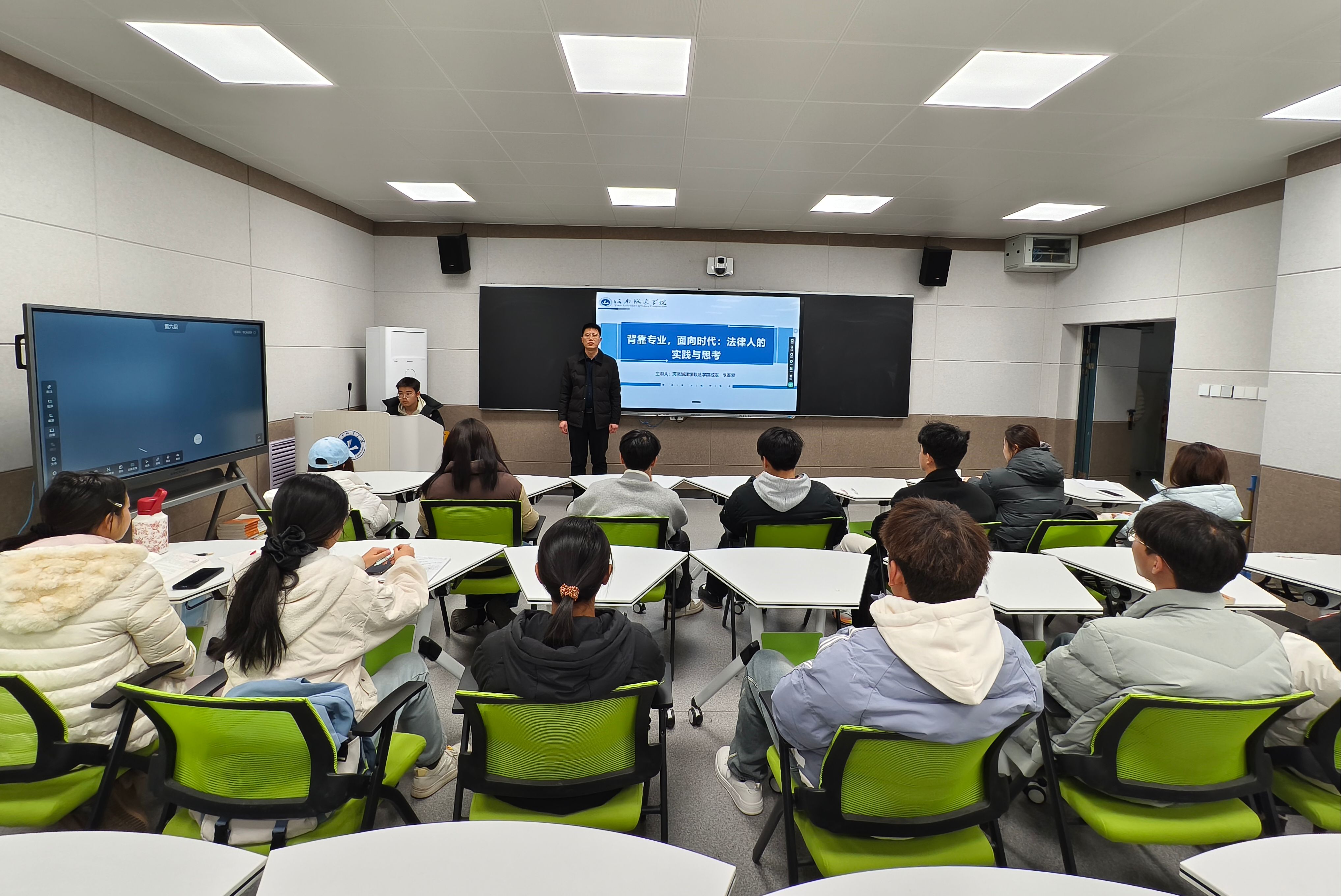 12月20日,由校友工作办公室、党委宣传部、学生处主办,法学院承办的第十五期校友创新大讲堂在美荟楼421智慧教室举行。法学院2015届校友、平顶山市公路事业发展中心安全科科长李军蒙应邀回母校作题为《背靠专业,面向时代:法律人的实践与思考》的专题报告。各学院师生代表近百人现场聆听。