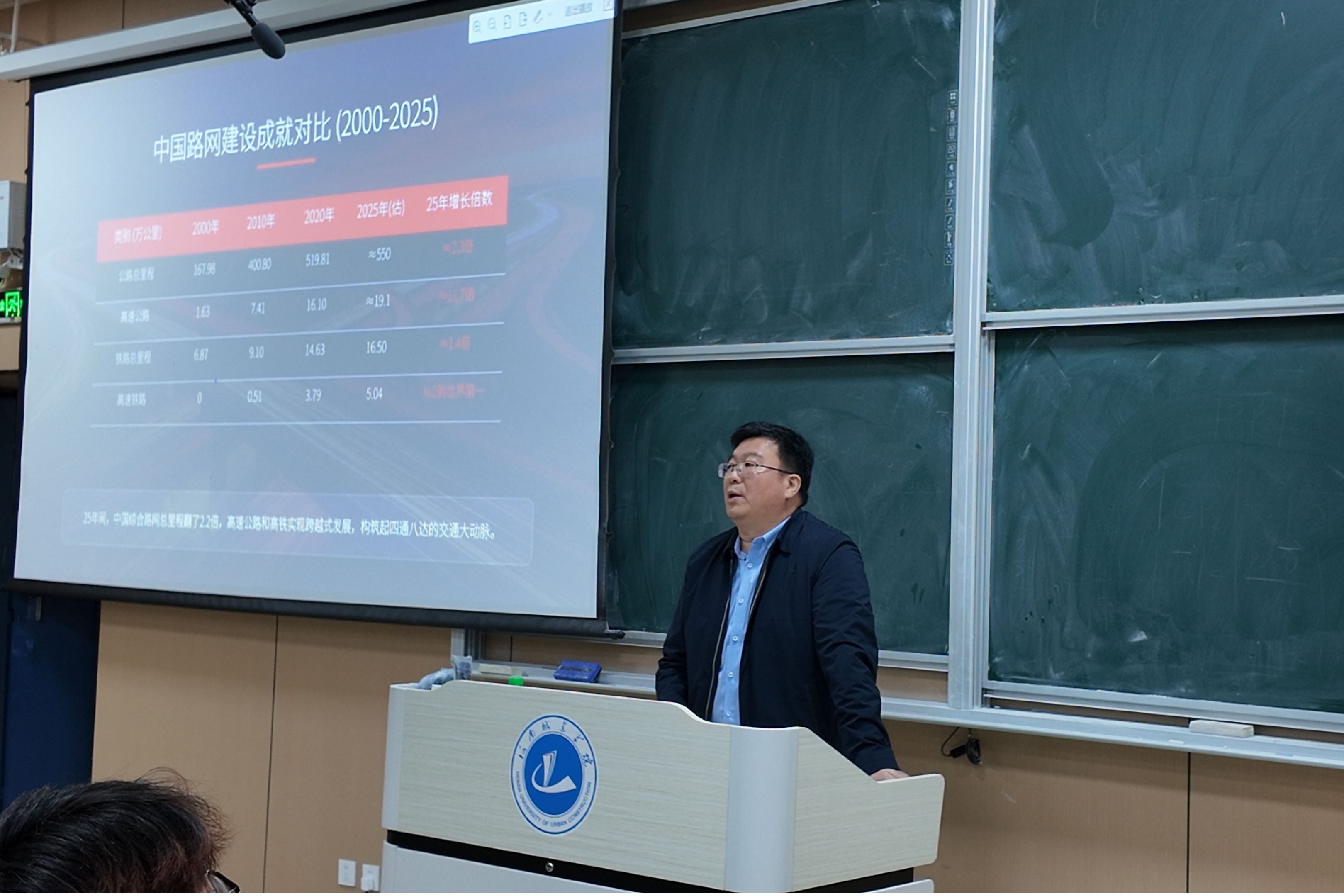 本次大讲堂特邀我校优秀校友、正高级工程师贾耀飞作题为《后基建时代转型发展与重塑路径》的主题报告。贾耀飞,2004年毕业于我校公路与城市道路专业,现任河南省公路工程局集团勘察设计院、河南省公路工程局集团检测技术公司、中科云筑工程管理(河南)有限公司书记、院长。他长期深耕公路工程技术研发与经营管理一线,曾任多条河南省内高速公路项目总工程师、项目经理,在基础设施建设领域积累了丰富的实战经验与深刻的行业洞察。