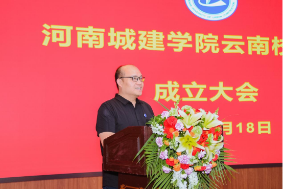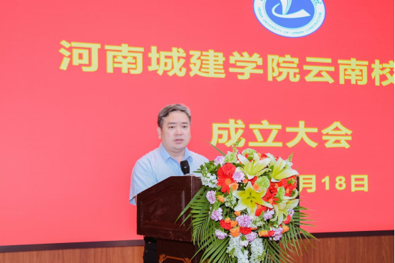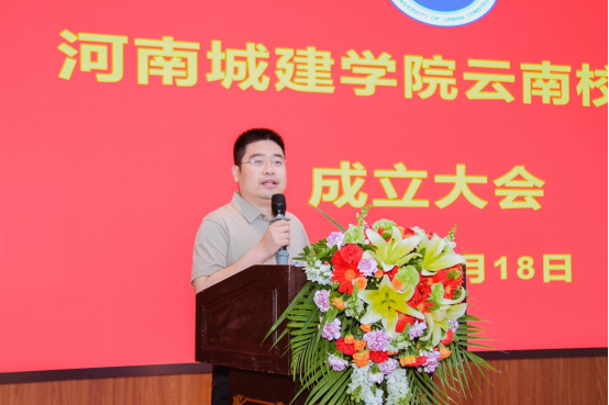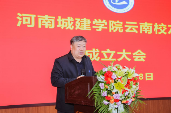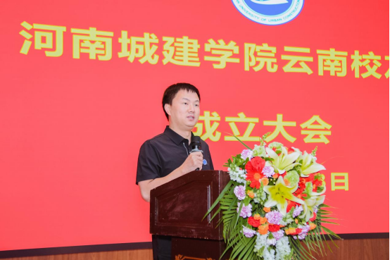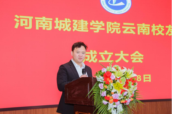 赵俊三致贺词。他代表云南云金地科技有限公司对河南城建学院云南校友会的成立表示热烈的祝贺。他指出,河南城建学院云南校友会的成立,就像在滇池之畔竖起了一座温暖的灯塔——它既是情感的归宿,也是前行的航标。他期待以河南城建学院云南校友会成立为契机,推动校际资源、校友资源与产业需求高效对接,让技术优势转化为发展动能,在产学研深度融合中释放更大的经济价值和社会价值。